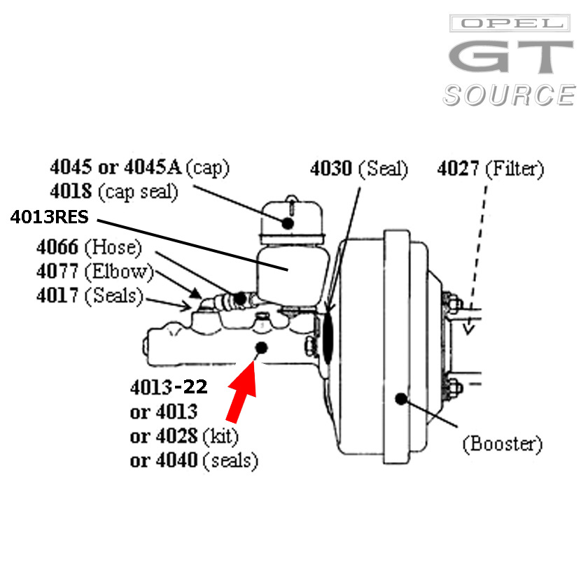 Fits all 1968 - 1973 Opel GT (and also all 1971 - 1972 Manta & Ascona with the ATE booster). Upgraded European style design features a higher-capacity 22 mm bore and a deleted side switch. Also includes master cylinder to booster seal, reservoir seals, copper washers for the front banjo fittings, and tech notes. (We also offer an original-style master cylinder as part #4013).